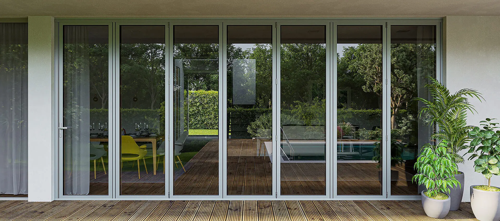 Faltschiebetüren: Faltschiebetüren bestehen aus mehreren Elementen, die sich beim Öffnen zusammenfalten.